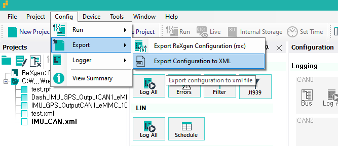 2. 아래와 같이 Export를 사용해서 1번 과정에서 설정한 구성을 XML로 출력 합니다.