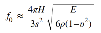 여기서 f0은 결함의 공진 주파수, H는 재료의 잔여 두께, r은 결함의 반지름, E는 영의 탄성 계수, υ는 포아송 비, 그리고 ρ 는 재료의 밀도입니다.