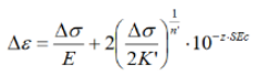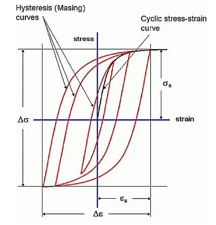 단축(uni-axial) 주기적 응력-변형률 곡선은 Ramberg-Osgood 관계를 사용하여 모델링됩니다.