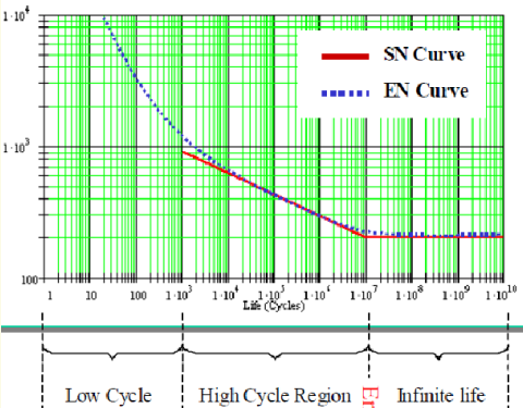 EN 커브의 특징은 SN 커브와는 달리 전체 수명에 대한 분석이 가능 합니다. 그리고 균열 끝에서 발생하는 소성 변형을 고려하여, 균열 성장을 보다 정확히 예측할 수 있습니다. 이는 소성 영역(Plasticity Area, Low Cycle)에서만 적용 됩니다.
