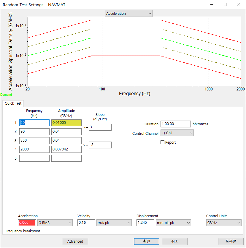 이번 시험은 VR Controller에서 제공하는 NAVMAP 랜덤 진동 시험 프로파일(Random Vibration Profile)을 사용해서 Kurtosis 값을 설정하는 시험을 진행합니다.