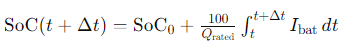 이 식(1)은 시간 t에서 t+Δt까지 배터리를 통해 흐르는 전류를 적분하여 초기 SOC에 더함으로써 새로운 SoC를 계산합니다. 이 계산은 배터리가 충전될 때는 양의 값, 방전될 때는 음의 값을 가지며 이를 통해 배터리의 현재 충전 상태를 업데이트합니다.