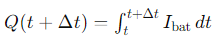 이 수식은 특정 시간 간격 동안 배터리를 통해 흐르는 전류의 총량을 측정하는데 사용됩니다. 이 값은 SoC를 업데이트하는 데 필요한 전류의 양을 제공합니다.