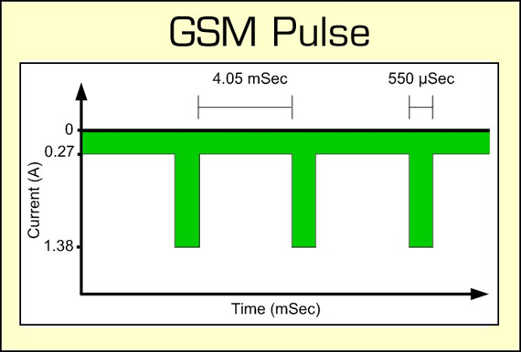 GSM 시험에서는 배터리에 최대 2암페어(A)의 전류를 부과합니다. 이 전류는 577 마이크로초(μs) 간격의 펄스 형태로 제공되며, 이는 매우 높은 주파수의 전류가 배터리를 통해 순간적으로 흐른다는 것을 의미합니다. 이러한 높은 주파수의 펄스 부하는 배터리에 큰 요구를 제기하며, 배터리는 이에 대응하여 커패시터처럼 동작하기 시작합니다. 이는 배터리가 일시적으로 매우 높은 전류를 감당할 수 있도록 하여 배터리의 동작 특성을 변화시키는 것입니다.