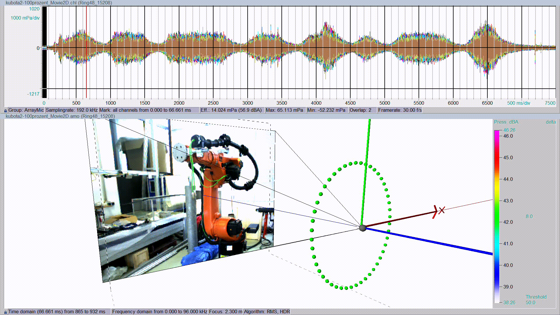 링 타입 음향 카메라는 자유장(freefield) 응용 프로그램과 유사하게 정밀한 소리원 위치를 파악하기 위해 사용됩니다. 자유장 응용 프로그램이란 음원으로부터의 직접 소리 전달만 고려되고 반사가 없는 환경을 말합니다.