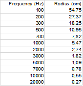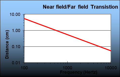 따라서 100 Hz에서는 55 cm까지가 근거리 영역입니다. 주파수가 증가할수록 근거리 한계 반경은 줄어듭니다.