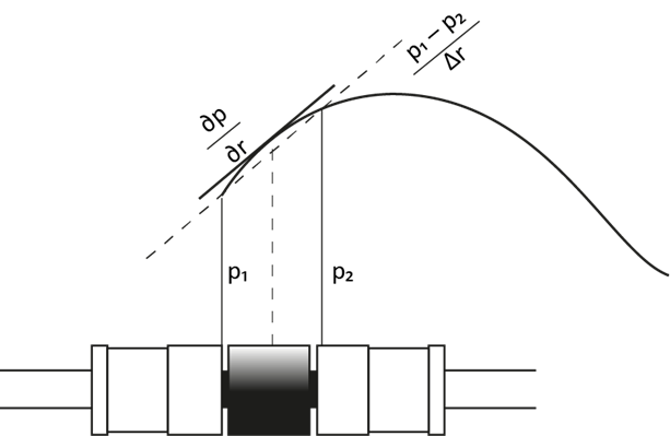 - 압력 측정: 두 마이크로폰에서 소리 압력 𝑝1과 𝑝2를 측정합니다.
