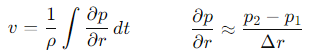 - 압력 구배 및 소리 속도 계산: 두 지점 사이의 압력 차이를 이용하여 압력 구배를 계산합니다.오일러 방정식은 소리의 속도 𝑣를 구하는 데 사용됩니다. 여기서 𝜌는 매질의 밀도입니다.