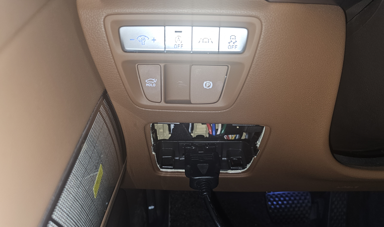 이번 실습에서는 G80 차량의 OBD2 데이터를 읽고 저장하는 방법에 대해 다룹니다. OBD2 통신은 Influx 사의 ReXgen Air를 사용하여 데이터를 저장합니다. 이 실습을 위해 운전석 왼쪽 하단에 있는 OBD2 포트와 ReXgen을 연결할 수 있도록 별도의 커넥터를 준비합니다.