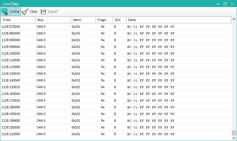 5. 실습 구성의 1번 ReXgen2 장비를 USB로 연결하고 CAN0을 Logging으로 설정해서 Upload를 진행후 Live로 2번 ReXgen2의 0번 포트로 신호가 아래와 같이 정상적으로 들어옴을 확인합니다.
