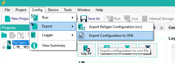2. 아래와 같이 Config -> Export -> Export Configuration to XML을 사용해서 해당 구성을 XML 파일로 만들어 줍니다.