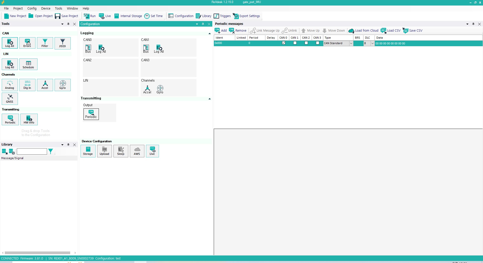 이번 실습은 앞서 실습 구성과 동일 합니다. 2번 ReXgen2 장치에 내장된 Gyro와 Accleration 센서의 값을 CAN Message로 추가해서 Port0으로 온도 신호와 함께 전송하는 실습니다.