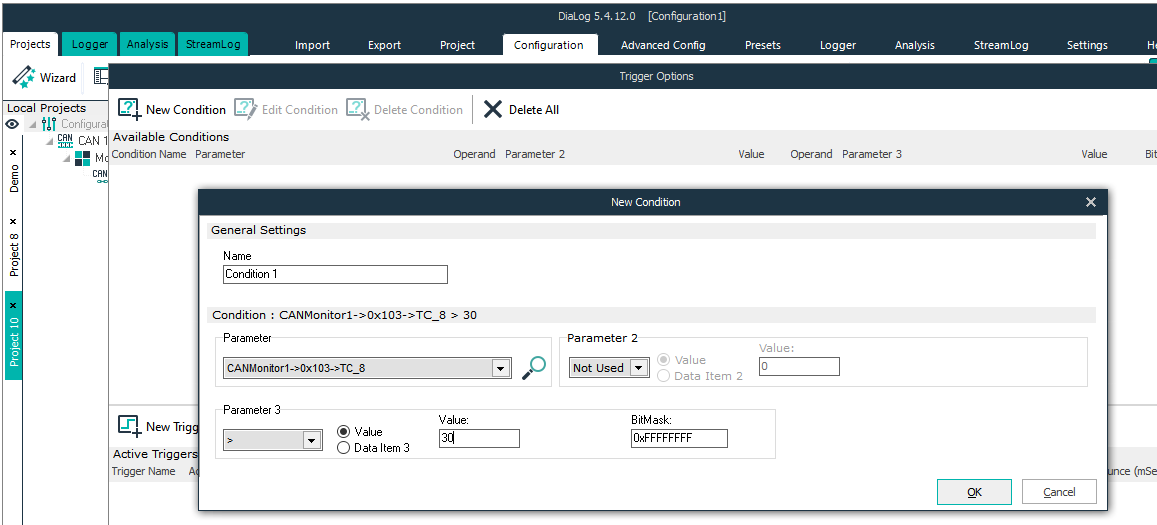 8. New Condiiton을 선택해서 Trigger 조건을 생성합니다. 이번 실습에서는 TC_8(온도센서 8번 채널)이 30도 이상일 경우를 조건으로 만들었습니다. 그리고 해당 조건 명을 Condition1로 작성하였습니다.