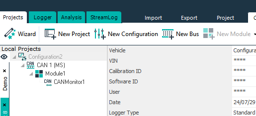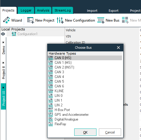 4. New Configuration을 선택하고 Bus 종류는 온도센서 모듈과 연결할 커넥터를 선택합니다. 이번 실습에서는 CAN1 커넥터에 연결하였으므로 CAN1(MS)를 선택합니다. 그리고 기존의 온도센서의 캔 속도를 500kbps로 설정하였으므로 REBEL CT의 속도도 500kbps로 설정합니다.