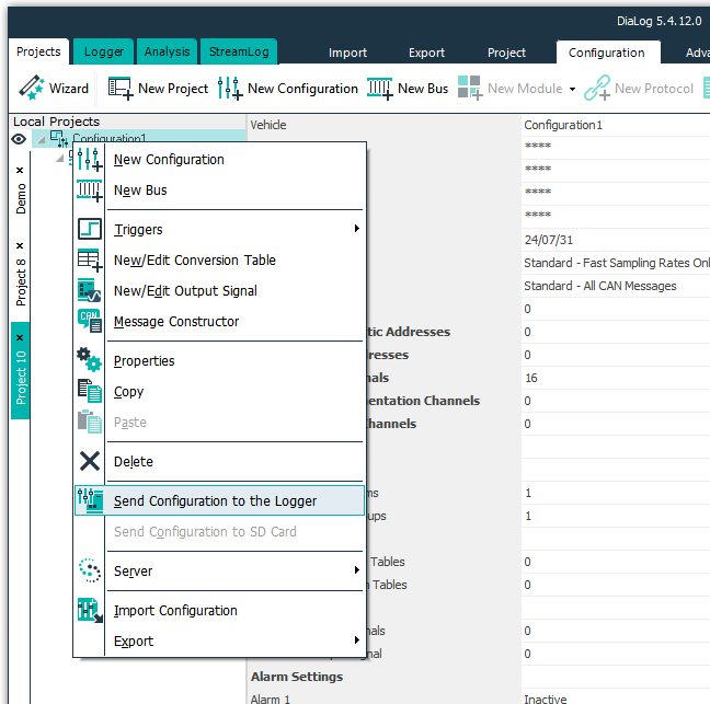 10. 완료된 설정을 아래와 같이 "Send Configuration to the Logger"를 사용해서 REBEL CT에 프로그래밍 합니다.