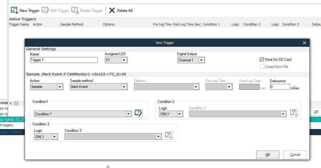 9. New Trigger를 통해서 트리거 동작을 설정합니다. 아래와 같이 트리거가 발생 시 REBEL CT4의 자체 F1 LED가 동작되게 하고 Digital Ouput의 채널1의 출력 값이 5V에서 0V로 떨어지게 하였습니다. 해당 트리거는 Mark Event로 로거에 기록되게 하였습니다. 해당 Trigger는 앞서 생성한 Condition 1 의 조건에서 동작 합니다.