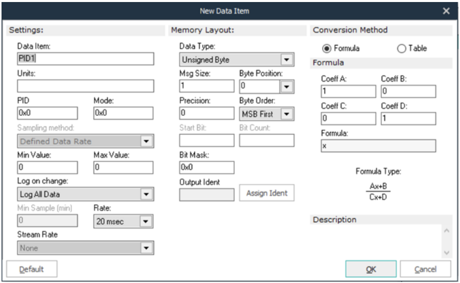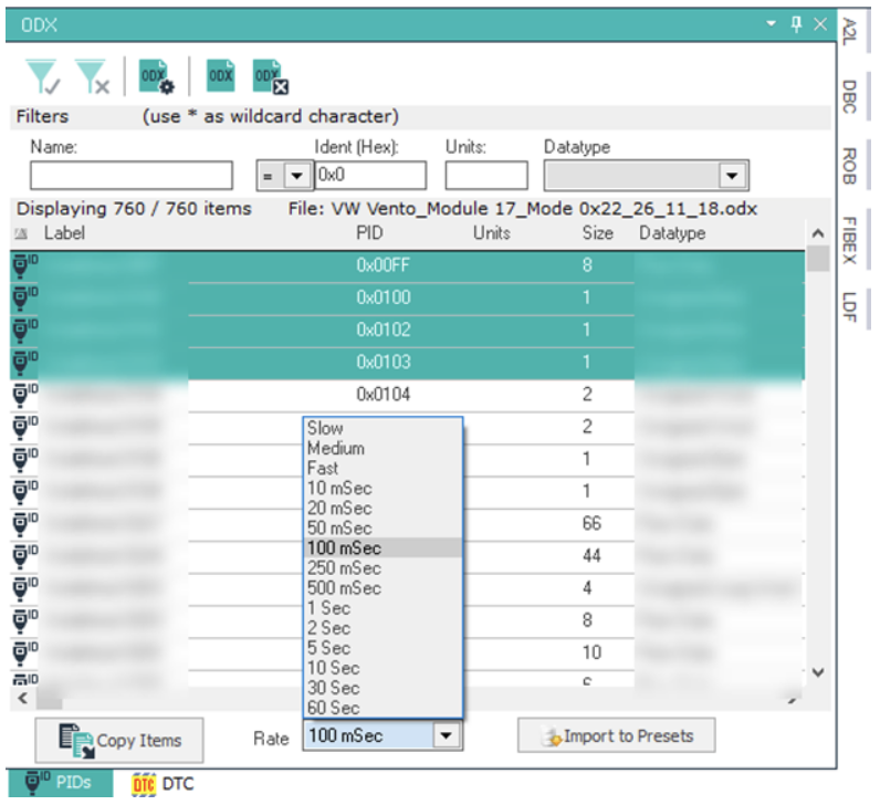 - 선택적 PID 가져오기: 여러 PID를 선택하여 가져올 수 있으며, 사용자 정의 폴링 속도 구성을 포함합니다. 개별 PID 입력, 요청 및 DBC(진단 버스 구성)를 통한 디코딩이 필요하지 않습니다. Dialog 소프트웨어는 드래그 앤 드롭 기능을 제공하여 PID가 포함된 ODX 파일을 가져올 수 있습니다.