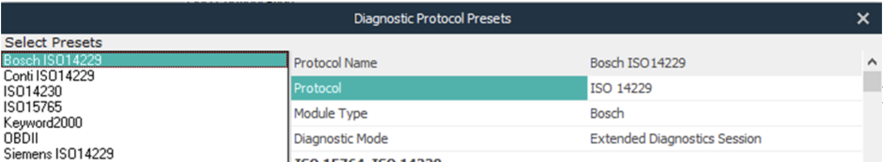 - 사용자는 진단 프로토콜을 지정하고, 관련 ISO 14229 프리셋을 선택하며 프리셋을 사용자 정의할 수 있습니다.