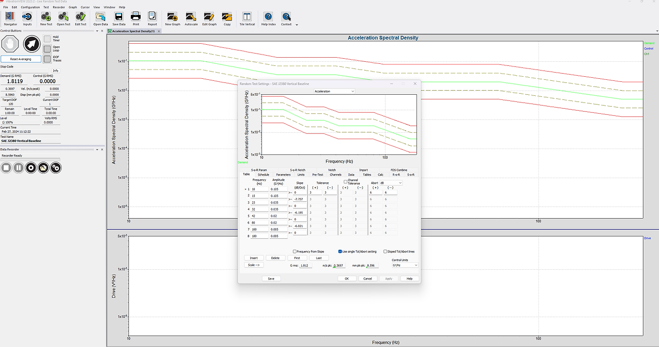- 프로파일 설정: 10Hz에서 2000Hz의 대역에서 각 축에 대해 다른 진폭으로 설정합니다.