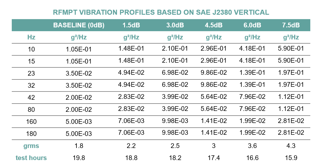 RFMPT는 Test-to-Failure 방식을 채택합니다. 즉, 제품이 초기 진동 수준을 견뎌내면, 진동 수준을 1.5dB씩 증가시켜가며 다시 테스트를 진행합니다. 이 과정은 제품이 고장에 이를 때까지 반복됩니다. 각 단계에서 진동 수준을 1.5dB씩 증가시키고, 시험 시간을 줄여가며 진행합니다. 이렇게 해서 각 단계가 제품의 수명 주기를 하나씩 나타내도록 합니다.