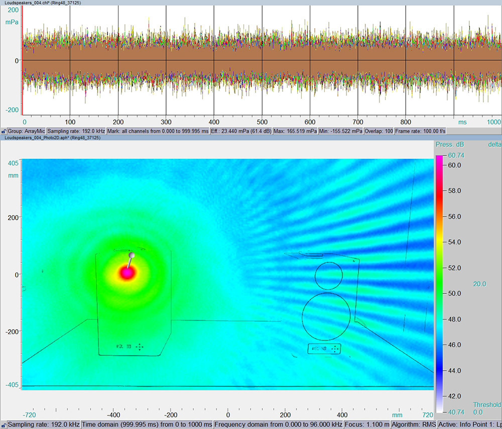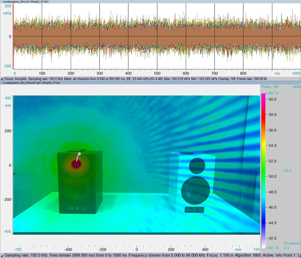 그림 1은 마이크로폰(Microphone) 배열 Ring48로 수집한 48개의 마이크로폰의 시간 신호와 해당하는 음향 사진을 보여줍니다. 이 사진에서 볼 수 있듯이 주된 소리 원천은 화이트 노이즈(20 Hz-22 kHz)를 생성하는 서브우퍼를 가진 스피커에서 발생합니다. 그림의 오른쪽에 위치한 두 번째 스피커는 첫 번째 스피커보다 23 dB 더 작아서 첫 번째 스피커의 사이드 로브(Side Lobe)에 의해 가려집니다.