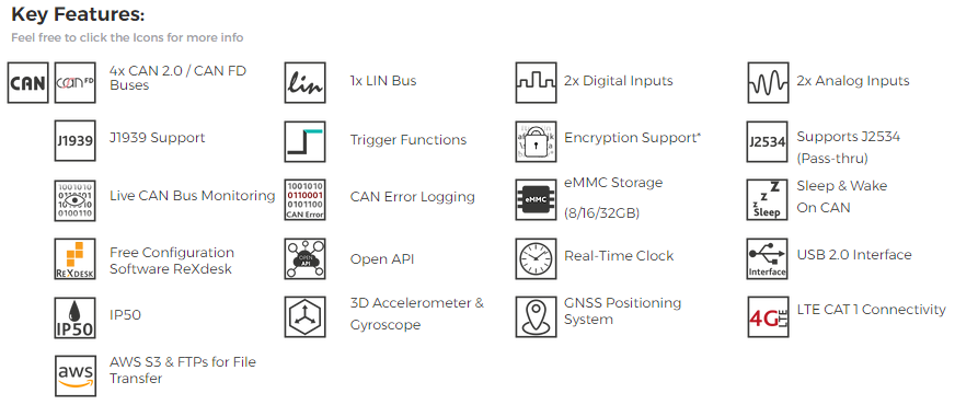 J1939 필터링 기능 외에도 다양한 기능을 제공합니다. 이 장치는 차량의 CAN 버스 네트워크에서 데이터를 효율적으로 캡처하고 분석할 수 있도록 설계되었습니다. 주요 기능으로는 고속 로깅, GPS 및 IMU 센서 통합, Wi-Fi를 통한 데이터 전송, 실시간 모니터링 등이 있습니다. 이러한 기능들은 차량의 성능 최적화, 진단 및 유지보수를 위해 필수적입니다. RexGen Air는 다양한 산업 분야에서 차량 데이터를 효율적으로 관리하고 분석하는 데 이상적인 솔루션입니다.