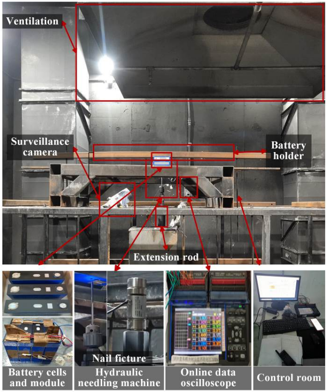 실험 환경은 25℃로 조절된 방폭실에서 진행되었으며, 배터리가 못에 의해 관통되는 동안 전압 및 온도 변화가 실시간으로 기록되었습니다. 표준 실험으로는 직경 6mm의 60도 각도의 원뿔형 스틸 못을 사용하여, 배터리 셀을 0.1mm/s의 속도로 천천히 관통시켜 80% 두께까지 침투하거나 감압 밸브가 작동할 때까지 진행했습니다.