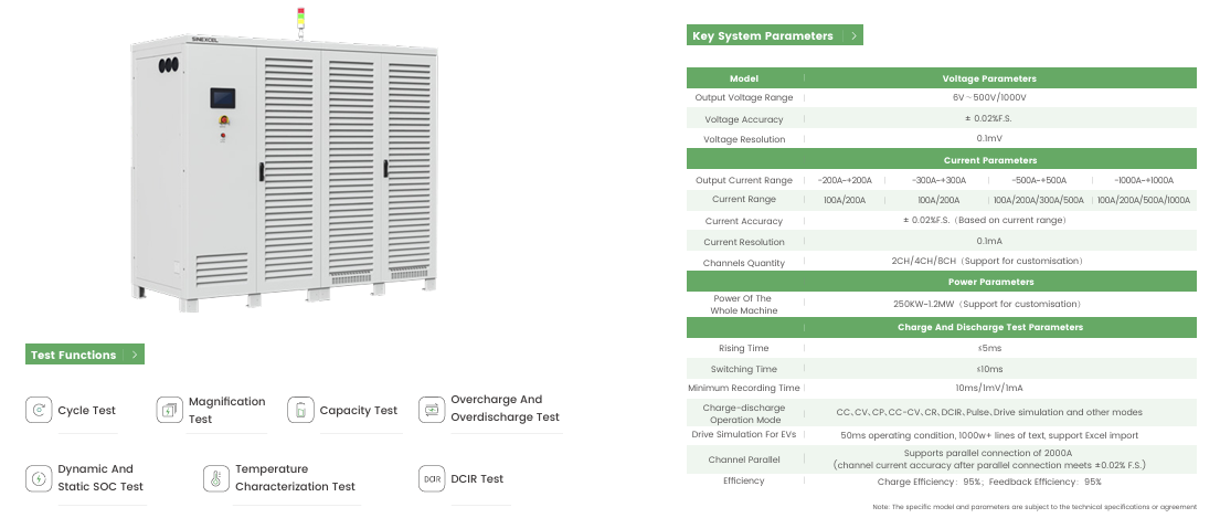 팜테크에서 판매 중인 Sinexcel의 배터리 충방전 테스트 시스템은 고정밀, 고속 응답, 그리고 효율적인 에너지 재생 기능을 갖춘 혁신적인 솔루션을 제공합니다. 이 시스템은 배터리 셀, 모듈, 그리고 패키지의 충전 및 방전 성능을 정확하게 평가할 수 있도록 설계되었으며, 다양한 테스트 시나리오를 지원합니다.