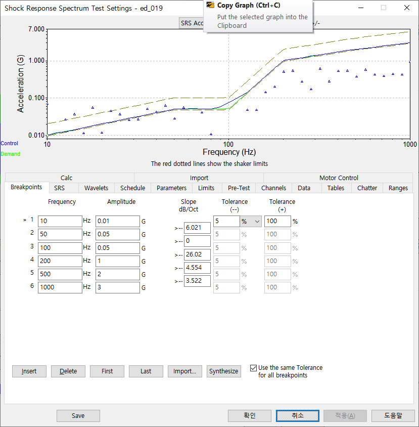 2. Breakpoints 의 주파수(Frequency), 진폭(Amplitude), Tolerance를 아래 그림과 같이 설정 합니다. 설정 완료 후 아래 "Synthesize" 버튼을 클릭하거나 SRS 탭으로 넘어 갑니다.