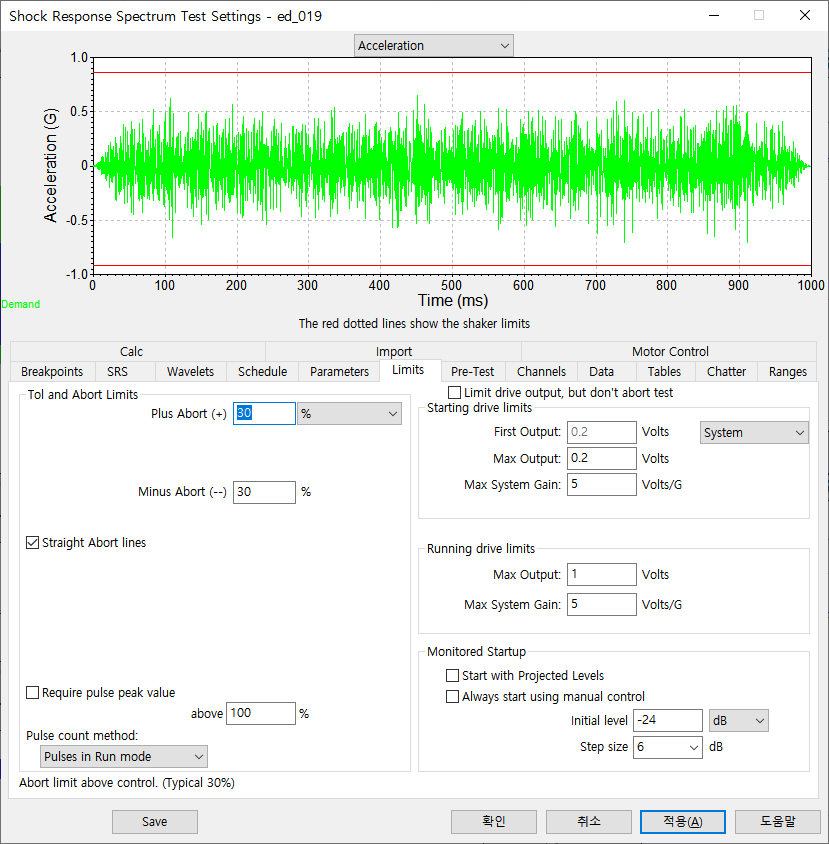 7. Limit에서 Strating drive limits의 Max Output 은 Abort 발생하지 않을 크기를 조절하면서 변경합니다.