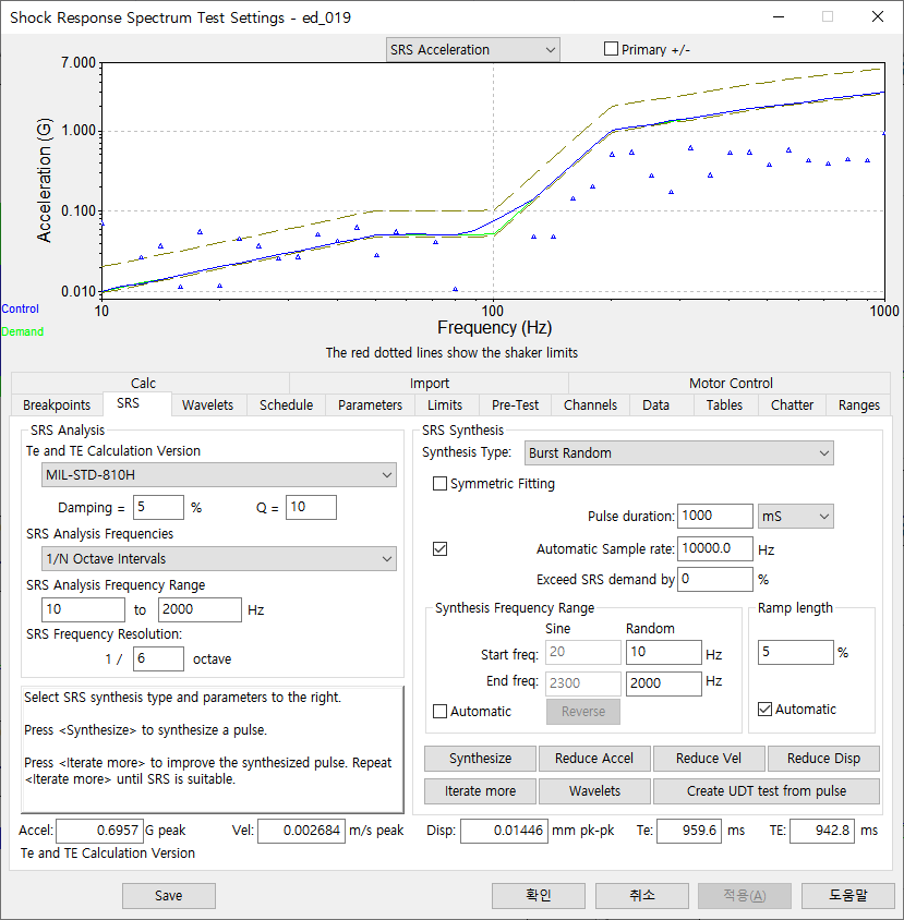 3. Te, TE 계산을 MIL-STD-810H 규격을 사용 합니다. SRS 분석을 위한 주파수 Resolution 설정을 아래와 같이합니다. SRS Synthesis는 해당 SRS 파형으로 합성시킬 파형을 정의 합니다. Burst Random 파형으로 합성합니다. "Synthesize"를 클릭하여 파형을 만들고 "Iterate more"를 사용해서 SRS tolerance에 값을 맞춥니다.