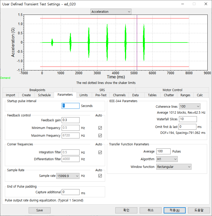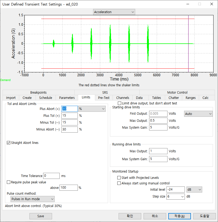 5. Limit은 Tolerance, Abort의 경계를 잡아 줍니다. Pulse 진폭에 따라 Starting drive limit의 잡아 줍니다. 값은 아래와 가이 설정해 줍니다.