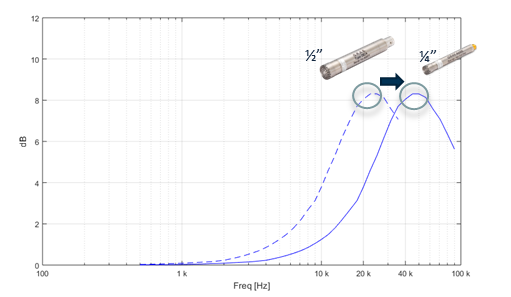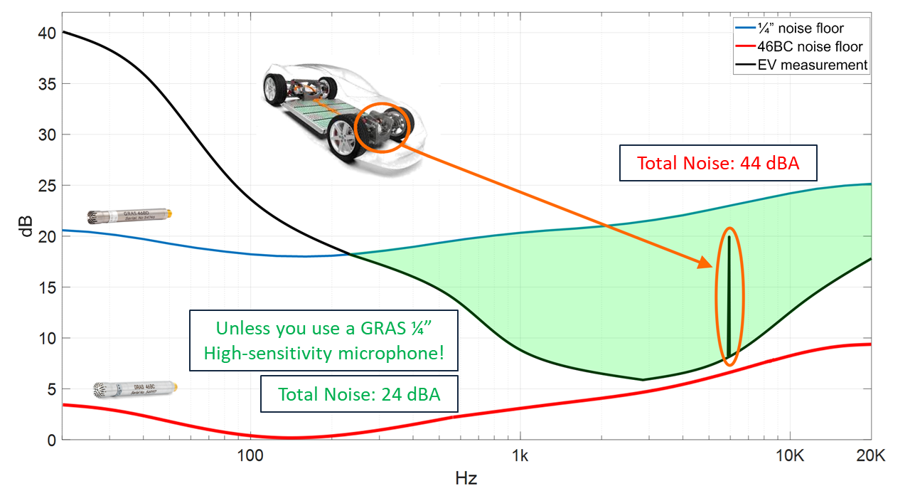 이 문제를 해결하기 위해 1/4인치 고감도 마이크로폰이 사용될 수 있습니다. 예를 들어, GRAS의 고감도 1/4인치 마이크로폰은 기존의 1/4인치 마이크로폰보다 낮은 노이즈 플로어를 제공하여, 24 dBA 수준의 저소음에서도 보다 신뢰성 높은 측정을 가능하게 해줍니다. 이러한 고감도 마이크로폰은 전기자동차처럼 저소음이지만 고주파 소음이 중요한 환경에서 소리 측정의 정확도를 크게 향상시킬 수 있습니다.