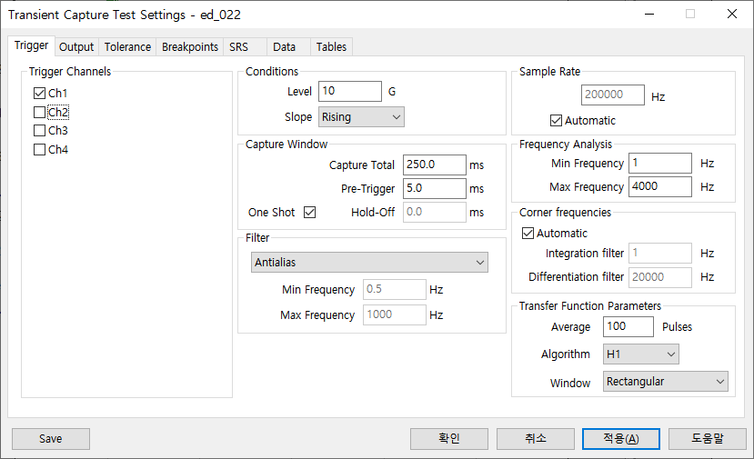 2. Trigger 걸 채널을 선택합니다(중복 가능). Trigger 관련 세팅을 하고 Sample rate와 Filter 주파수(Frequency)를 설정 합니다. 분석(Analysis) 관련 설정도 아래와 같이 완료 합니다.
