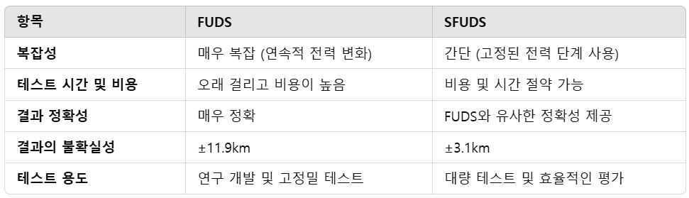 반면, SFUDS는 FUDS의 복잡성을 줄이고 효율성을 극대화하기 위해 설계된 단순화된 테스트 방식이다. SFUDS는 일정한 전력 단계를 기반으로 20단계로 구성된 방전 프로파일을 사용하며, 연속적 전력 변화 대신 5개의 고정된 전력 수준을 적용한다. 이를 통해 FUDS와 유사한 테스트 결과를 제공하면서도, 테스트 비용과 시간이 크게 절감된다. SFUDS는 평균 전력, 최대 전력, 에너지 소비량 등 주요 지표에서 FUDS와 거의 동일한 성능을 보여주며, 주행거리 예측의 불확실성도 ±3.1km로 줄어든다.