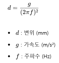 진동 시험에서 변위는 주어진 가속도와 주파수를 기반으로 결정됩니다. 특히 저주파(10Hz 이하)에서 변위 요구량이 급격히 증가할 수 있습니다.