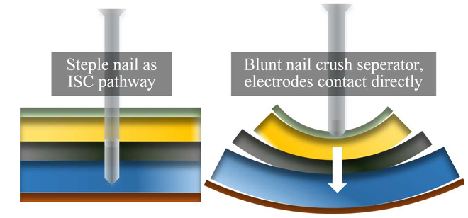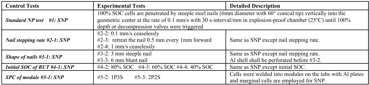 - 못은 6mm 직경, 60° 각도의 원뿔형 강철 못을 사용하였으며, 0.1mm/s의 속도로 배터리를 관통하도록 설정되었습니다.