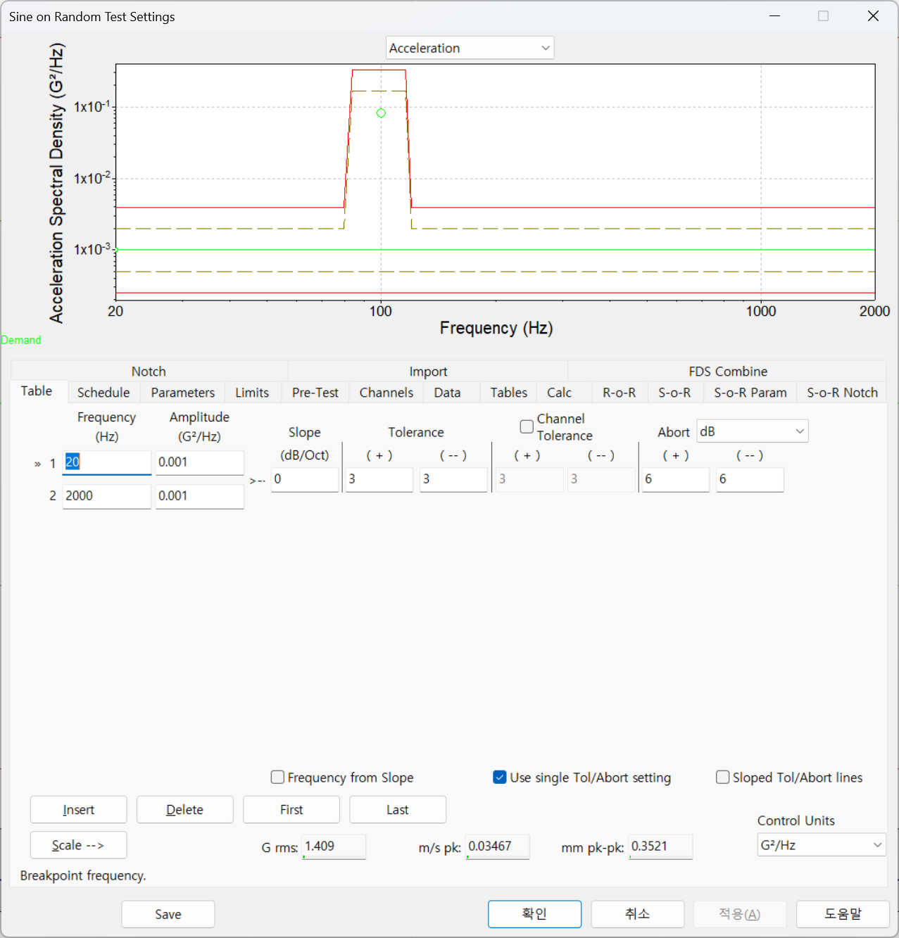 - 진폭(Amplitude): g (중력 가속도) 단위로 설정 (예: 1g, 2g, 3g)