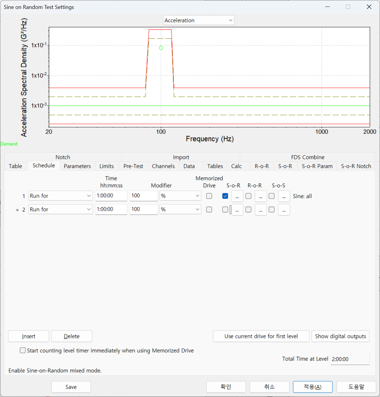 - Schedule 탭에서 특정 테스트 레벨에서 Sine Tone을 켜거나 끌 수 있음