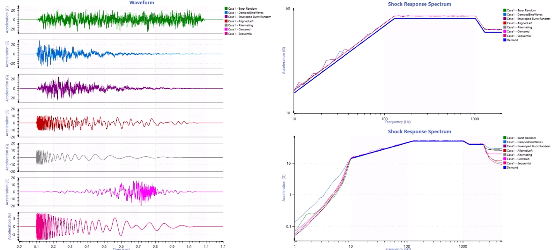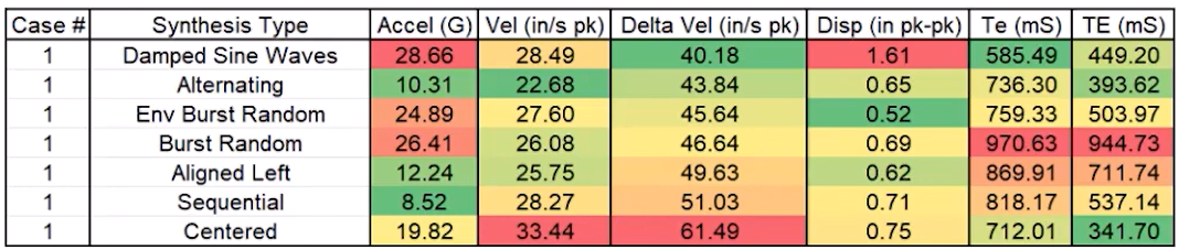 SRS 시험에서는 목표 응답 스펙트럼을 만족하는 신호를 합성하는 과정에서 여러 가지 방법을 사용할 수 있다. 대표적인 신호 합성 방식으로는 뎀프드 사인파(Damped Sine Wave), 웨이브릿 합성(Wavelet Synthesis), 랜덤 신호(Random Signal) 등이 있으며, 동일한 SRS 요구 조건을 충족하더라도 사용하는 신호 합성 방식에 따라 가속도, 속도, 변위 프로파일이 달라질 수 있다. 따라서 시험 사양에서 신호 합성 방식을 명확히 지정하지 않으면 연구소마다 서로 다른 형태의 충격을 제품에 가할 가능성이 높다.