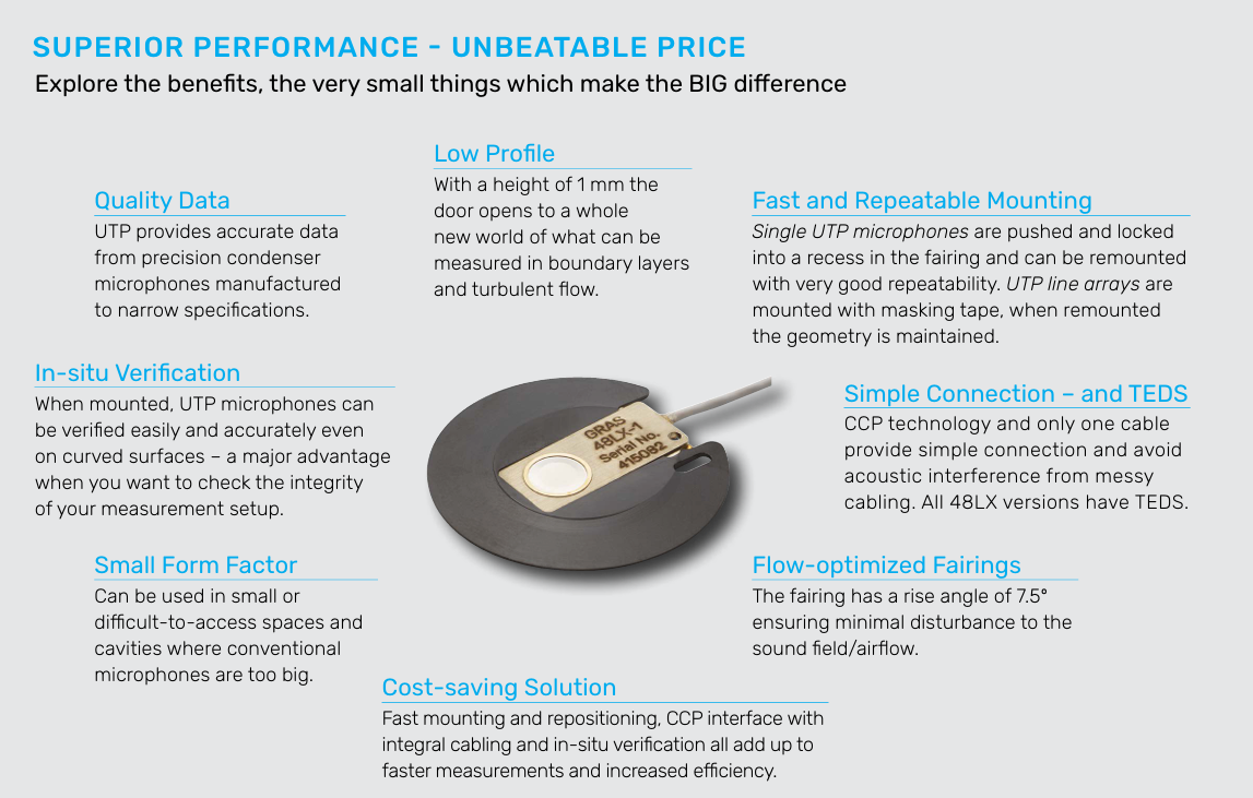 예를 들어, GRAS의 정밀 마이크로폰은 실제 환경에서의 측정뿐 아니라 CFD(전산유체역학) 모델의 실험적 검증 및 소음 예측 모델의 보정에도 활용된다. 특히 Ultra-Thin Precision (UTP) 마이크로폰은 높이가 1mm에 불과하여 경계층 내부에서도 소음을 정확히 측정할 수 있다.