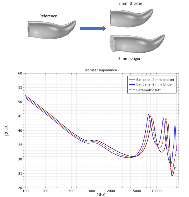 시뮬레이션 결과를 통해 귀관의 모양(shape)은 약간의 차이를 유발할 수 있으나, 기본적으로는 귀관이 직선형이든 곡선형이든, 또는 단면이 원형, 타원형, 삼각형이든 간에 전송 임피던스에 미치는 영향은 매우 미미하다는 사실을 알 수 있었습니다. 다만, 귀관의 부피(volume)와 길이(length)는 측정 결과에 상당한 영향을 미칩니다. 귀관의 부피가 커지거나 작아질 경우, 특히 18kHz의 주요 오디오 주파수 대역에서 12dB 정도의 차이가 발생할 수 있습니다.