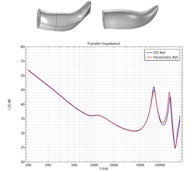 이러한 문제를 보다 깊이 이해하기 위해, 이번 페이퍼에서는 COMSOL 소프트웨어를 이용하여 ITU-T 권고안 P.57 Type 4.3 모델을 기반으로 귀관의 다양한 형태 변화를 고려한 주파수 영역 시뮬레이션을 수행하였습니다. 이때 이어폰은 귀관 안에 삽입하되, 참조면(reference plane)을 넘어서는 삽입은 하지 않는 조건으로 실험을 진행하였습니다.
