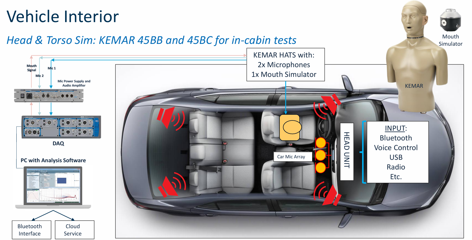 차량 내 음향 환경을 보다 현실적으로 재현하기 위한 시스템으로는 KEMAR Dummy Head가 있다. GRAS의 KEMAR 45BB 및 45BC는 실제 사람의 청취 구조를 모사한 인체 모사 장치로, 양쪽 귀에 마이크를 내장하고 입 모사용 시뮬레이터도 포함되어 있다. 이를 통해 오디오 시스템, 스마트 어시스턴트, 블루투스 통신 마이크 등의 실제 사용 환경에서의 성능을 정밀하게 측정할 수 있다.