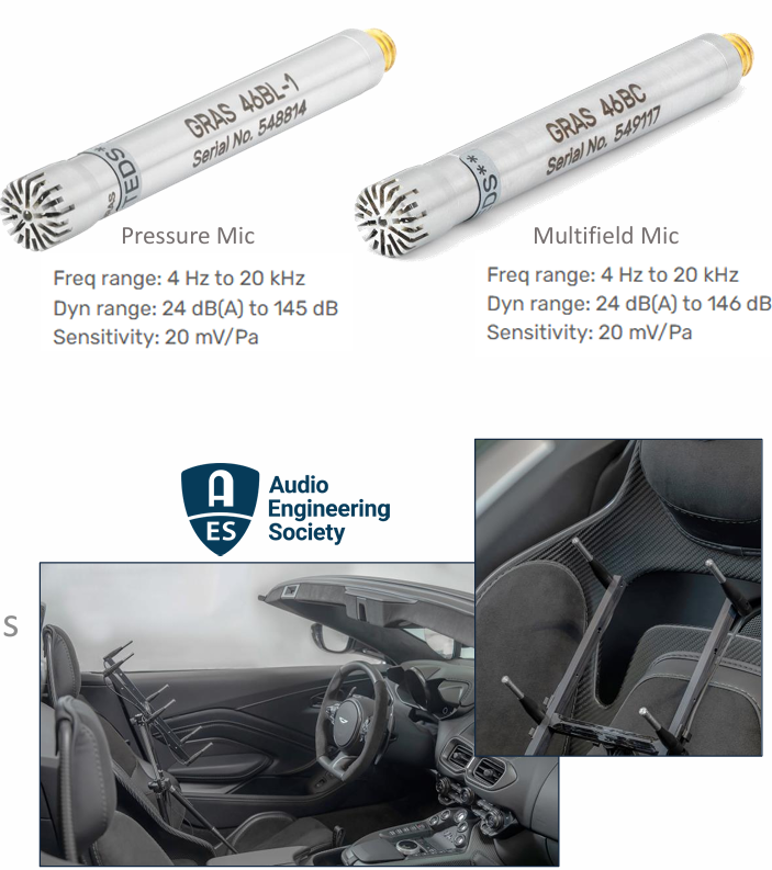 GRAS는 이러한 요구에 대응하기 위해 고감도 ¼인치 마이크 시리즈를 제공하고 있다. 이 마이크들은 소형 구조로 인해 음장에 미치는 영향이 적고, 높은 감도와 낮은 노이즈 플로어를 동시에 만족시켜 차량 내부 측정에 적합하다. 46BL-1 모델은 압력장을 위한 마이크로, 정밀한 압력 변화를 측정할 수 있으며, 46BC 모델은 다양한 음장 조건에서도 일관된 응답을 제공하는 멀티필드 마이크이다. 이 두 제품 모두 AES(Audio Engineering Society)에서 권장하는 차량 내 음향 시스템 측정 기준을 충족한다.