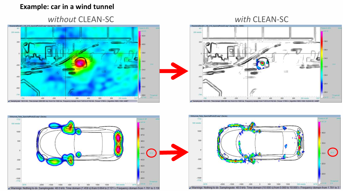 CLEAN-SC는 자동차 풍동 측정과 같이 복잡하고 다양한 음원이 존재하는 환경에서 특히 효과적입니다. 예를 들어, 풍동 내 자동차의 소음 분석 시 CLEAN-SC를 적용하면 기존 빔포밍만 사용했을 때보다 훨씬 더 선명하고 상세한 음원 지도를 얻을 수 있습니다. 이는 소음 발생 지점을 정확히 파악하여 소음 저감 대책을 수립하는 데 중요한 정보를 제공합니다.