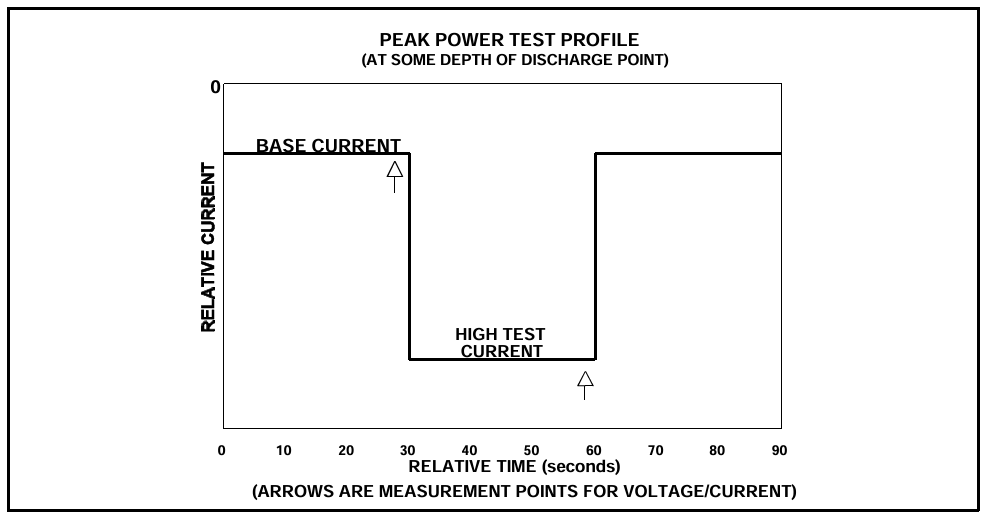 2. 상위 시험 전류 (High Test Current): 시험 중 30초간 가해지는 고전류 펄스입니다. 이 값은 (a) 제조사가 정한 최대 정격 전류와 (b) 정격 피크 전력을 80% DOD에서의 OCV의 2/3 값으로 나눈 '정격 피크 전류'의 80% 중 더 작은 값으로 결정됩니다.