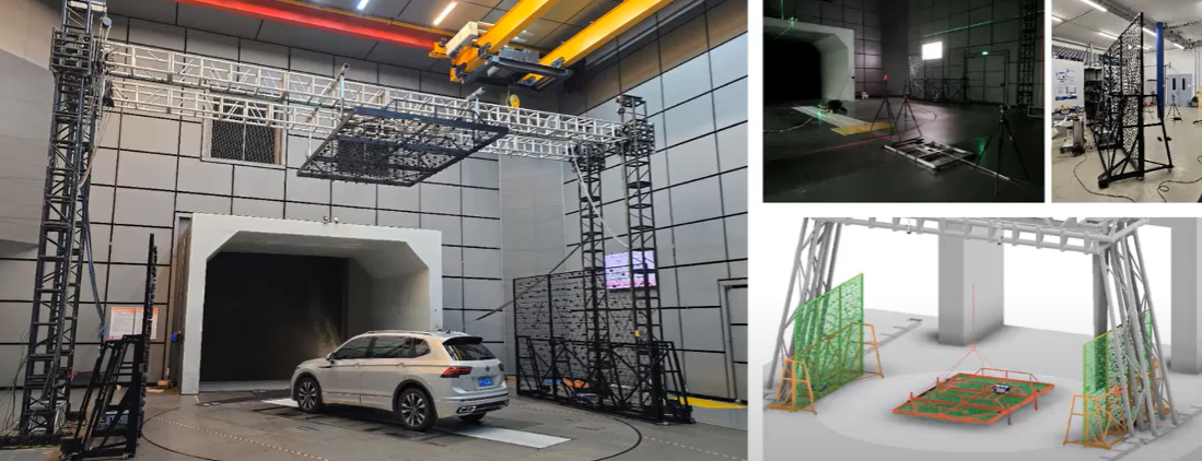 - 시험부 (Test Section): 실제 차량이나 모델이 위치하는 공간입니다. 이곳의 바닥에는 롤링 로드(Rolling Road) 또는 **무빙 벨트 시스템(Moving Belt System)**이 설치되어, 차량의 바퀴를 회전시키고 지면이 움직이는 효과를 시뮬레이션합니다. 이는 실제 도로 주행 시 차체 하부의 공기 흐름을 정확히 재현하는 데 필수적입니다.