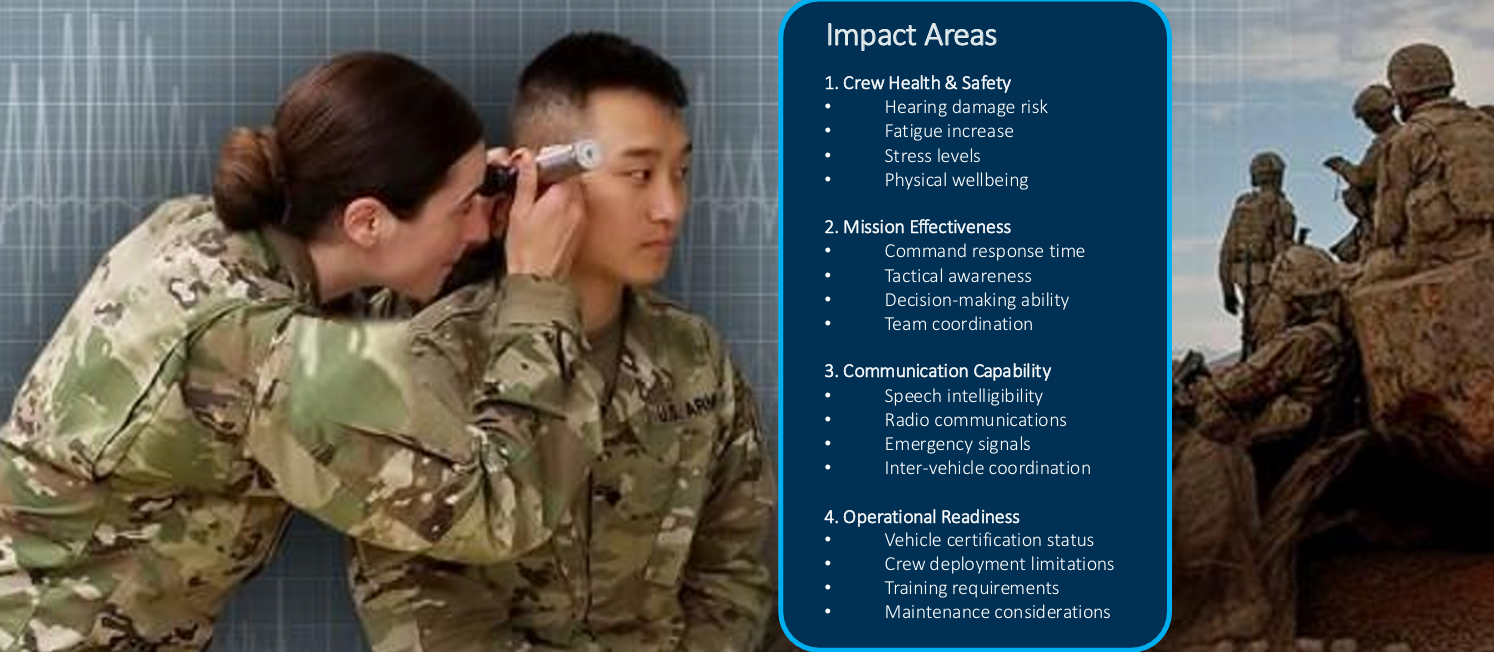 - 승무원 건강 위협: 장갑차 내부 소음은 고속 주행 시 118 dB(A)를 초과할 수 있으며 , 이는 소음성 난청(NIHL)의 주요 원인이 됩니다. 영국에서는 약 30만 명의 퇴역 군인이 청력 손실로 고통받고 있습니다. 이는 승무원의 건강과 안전에 직접적인 위협입니다.