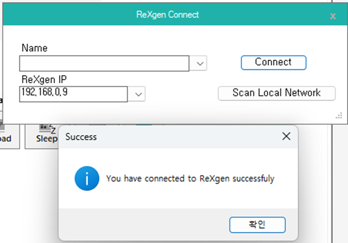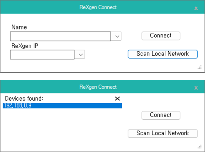 16. Devices found 옆 x를 클릭한 후, ReXgenIP 부분에 확인된 IP를 입력하고 Connect를 클릭한다.
